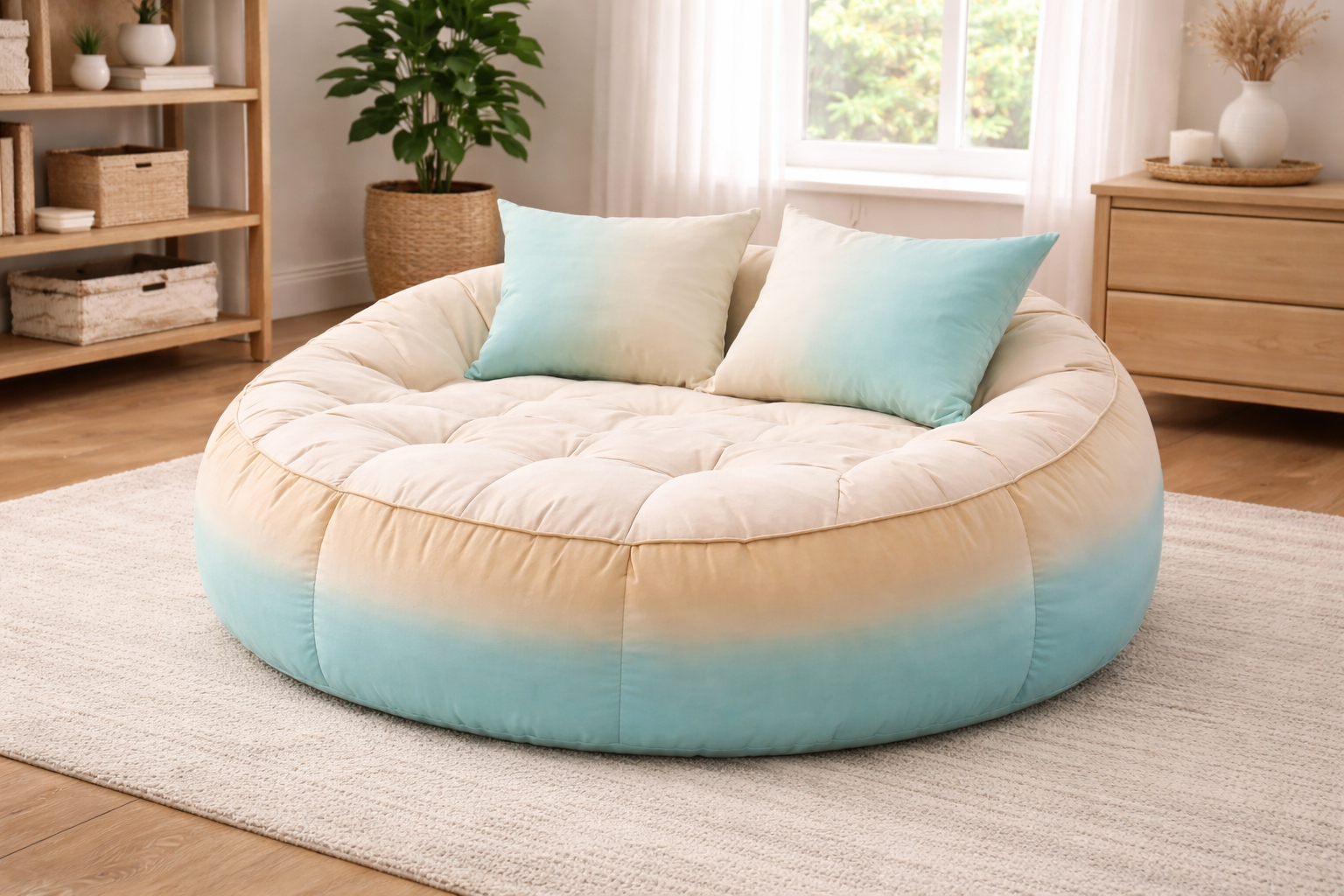 Canapé pouf rond capitonné avec coussins – Beige